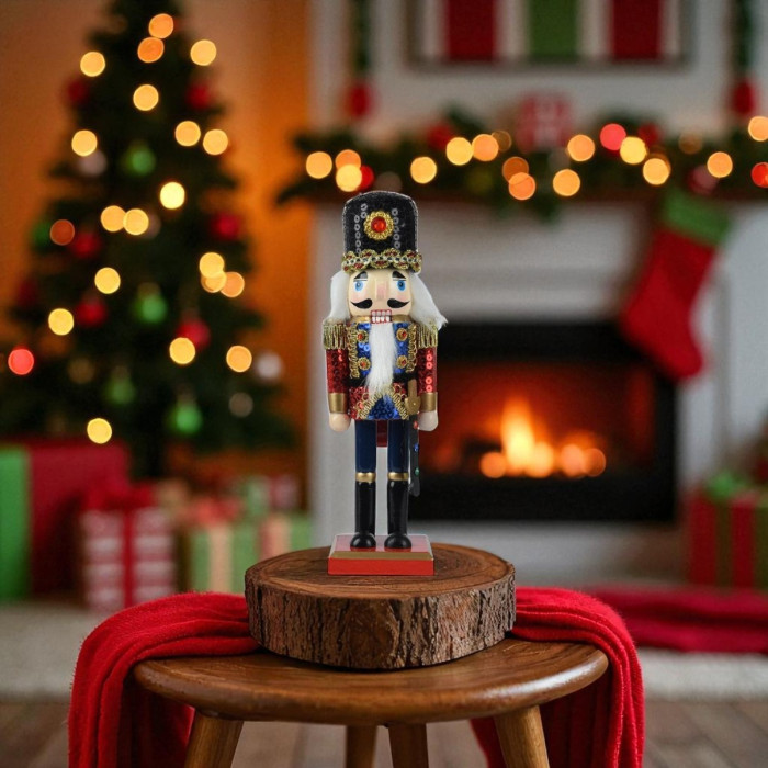 Deze klassieke notenkraker is 25 cm hoog. Zijn glinsterende pailletten geven hem een moderne look, terwijl de gedetailleerde afwerking, zoals zijn glanzende sabel, zijn elegante charme benadrukt.