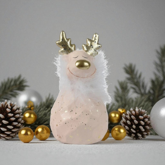 Breng een speelse en elegante touch aan je kerstdecoratie met dit handgemaakte terracotta rendier in de kleur lichtroze. Het rendier is gedetailleerd afgewerkt met een gouden gewei, een gouden neus, en verfijnde gouden spikkels op zijn lichaam, gecombineerd met een luxe witte bontkraag. Dit rendiertje is perfect voor het toevoegen van een feestelijke en stijlvolle uitstraling aan je interieur.