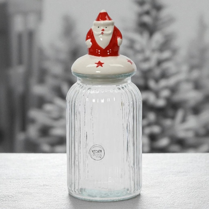 - Glazen koekjespot met vrolijke kerstman op het deksel
