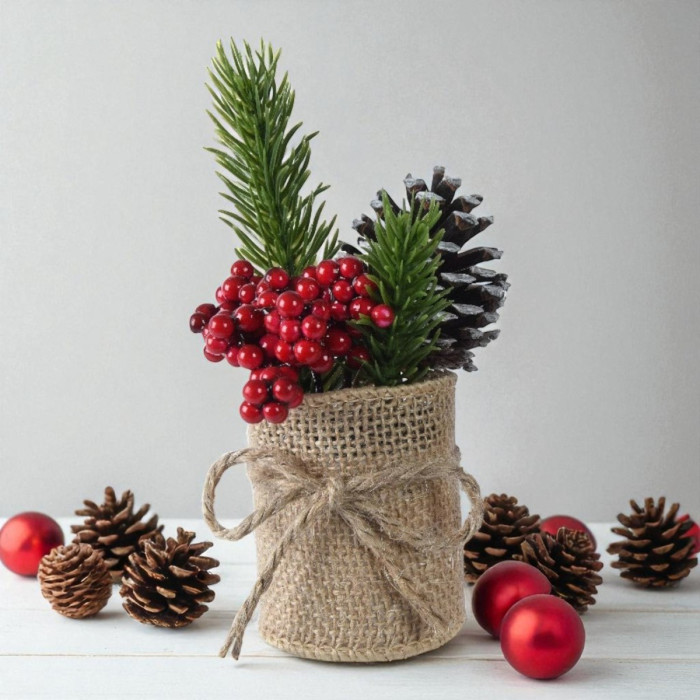 Breng een vleugje natuurlijke kerstvreugde in huis met dit Micro Kerststukje met Rode Besjes. Met zijn compacte afmeting van ø5x15 cm is dit kerststukje ideaal voor het toevoegen van een subtiele, feestelijke sfeer aan elke hoek van je huis. Het arrangement bestaat uit twee mini-dennentakken, levendige rode besjes en een decoratieve dennenappel, allemaal prachtig gestyled in een jute potje met een charmante strik.