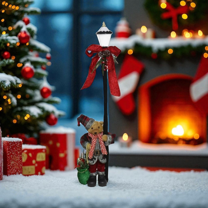 Deze beer met lantaarnpaal en LED verlichting brengt direct kerstsfeer in huis! De schattige knuffelbeer in winterse kerstoutfit staat naast een klassieke lantaarnpaal, die dankzij de ingebouwde LED-lamp zorgt voor een warm lichtje tijdens donkere dagen. Een perfecte blikvanger voor in de hal, woonkamer of bij de kerstboom.