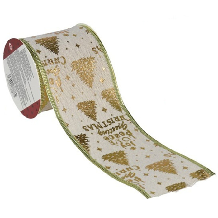 Breng een feestelijke touch aan je kerstdecoraties met dit gouden kerstlint met kerstbomen. Het lint is versierd met glanzende gouden kerstbomen en sterren op een neutrale ondergrond en afgewerkt met een fijne goudkleurige rand. Ideaal om cadeautjes mee in te pakken, kerstkransen te versieren of een tafeldecoratie net wat specialer te maken.