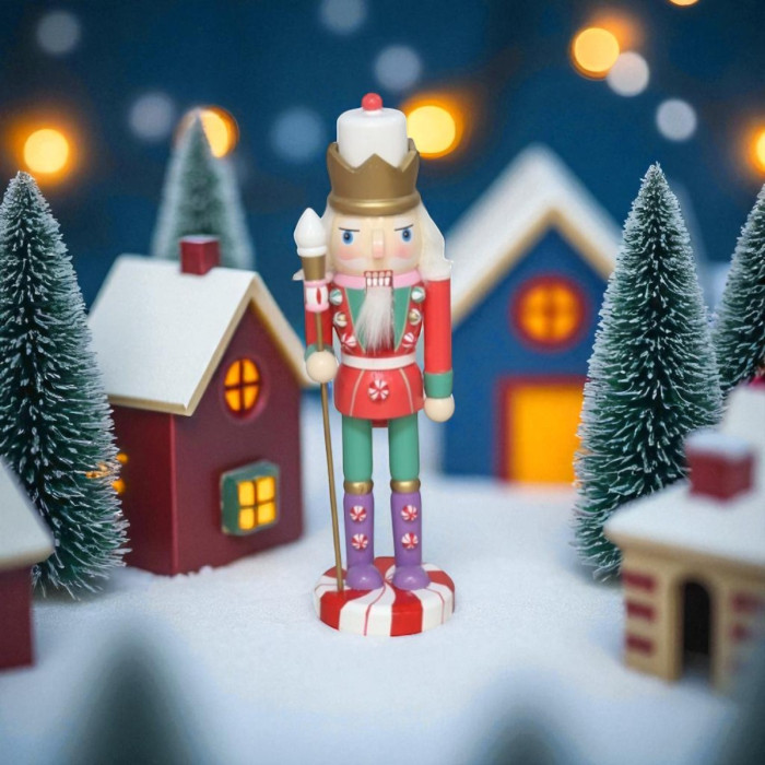 Maak kennis met de koninklijke notenkraker die jouw kerstdecoratie een vorstelijke twist geeft! Met zijn gouden kroon, rood pak versierd met suikerzoete details en een staf die is afgewerkt met een pepermuntsnoepje, brengt hij een charmante mix van traditie en speelsheid. Zijn kleurrijke outfit en snoep-accenten maken hem tot de perfecte beschermer van je kerstcadeautjes!