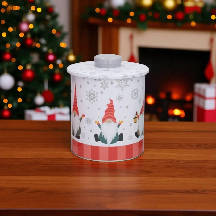 Deze voorraadpot is versierd met vrolijke kerst gnomen, sneeuwvlokken en een opvallende rood gestreepte rand. De witte achtergrond en het speelse ontwerp maken de pot tot een functioneel én decoratief item tijdens de feestdagen.
