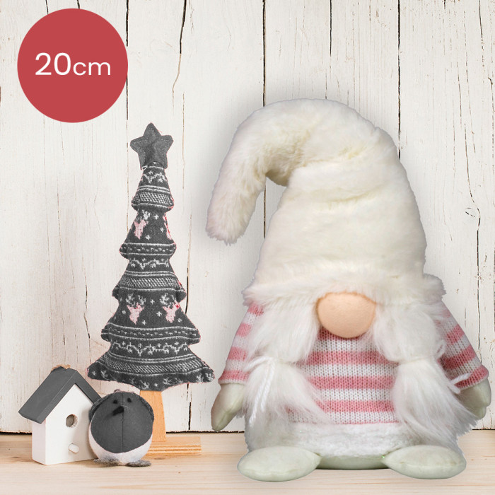 Dit Gnoom-vrouwtje zal je hart veroveren met haar schattige uitstraling. Ze draagt een witte donzige muts en een trui met roze/witte strepen, wat haar een charmante en vrolijke verschijning geeft.