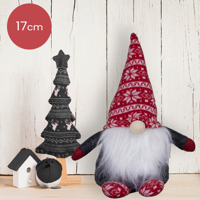 Grijs handgemaakt Gnoom-mannetje met rode muts en witte sneeuwvlokken - 17(25)cm