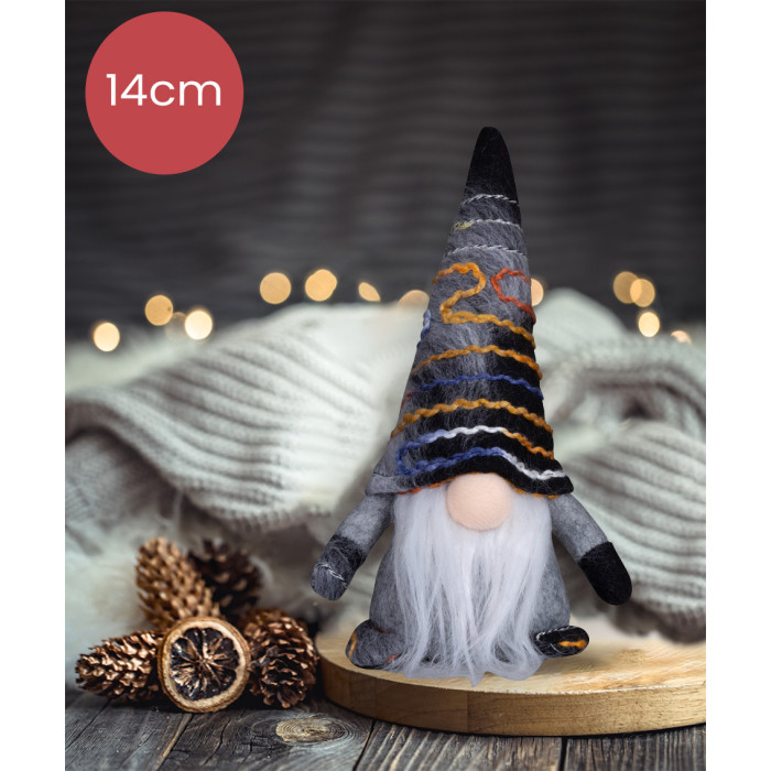 Handgemaakte Gnoom met zwarte puntmuts en bruin/paars geborduurde strepen - 14(20)cm