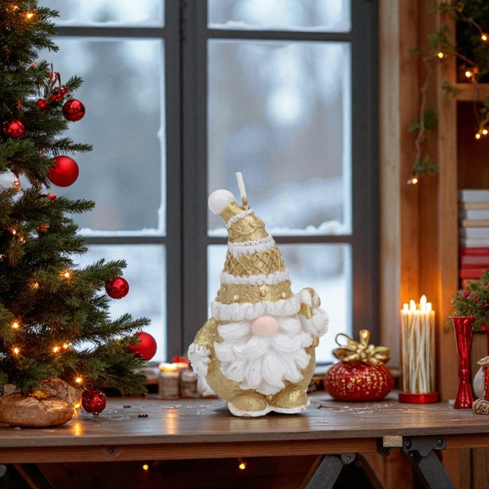 Deze gouden gnoom kaars in de vorm van een man brengt een vrolijk accent op tafel. Met zijn lange witte baard, puntmuts met gouden details en zijn speelse uitstraling past hij perfect bij de feestdagen.