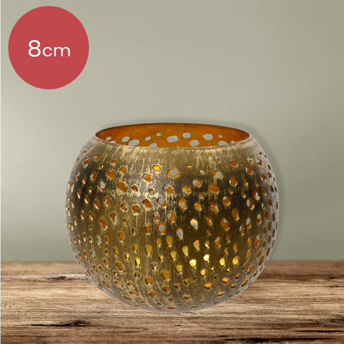 Deze prachtige gouden ijzeren waxinelichthouder voegt een vleugje stijl en warmte toe aan elke kamer. De gaatjes in de houder creëren een mooi en sfeervol patroon wanneer het waxinelichtje brandt.