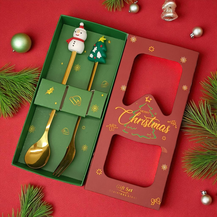 Goudkleurige kerst lepel en vork met sneeuwpop en kerstboom in geschenkdoos - 2-delig
