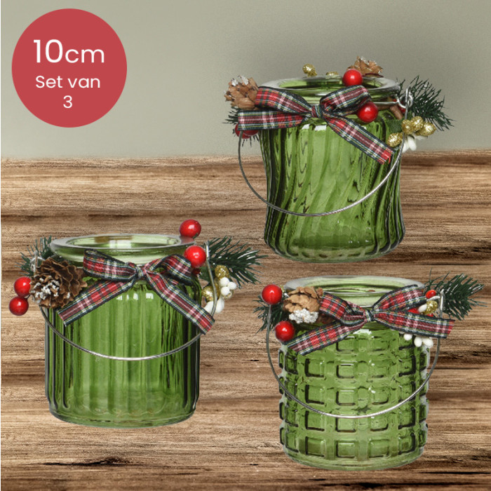 Groene glazen waxinelichthouders met verschillende patronen - Set van 3 - Ø8 x 10 cm