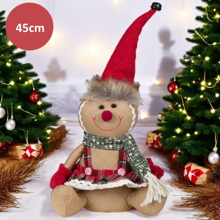 Met haar lengte van 45 cm, gemeten van haar schattige voetjes tot haar puntmuts, past zij perfect op een tafel, schoorsteenmantel of in de vensterbank. Gemaakt van zachte stof en vol grappige details, is dit peperkoekvrouwtje de ideale metgezel voor de feestdagen. Ze ziet er misschien lekker uit, maar wees gewaarschuwd – ze is niet om op te eten!
