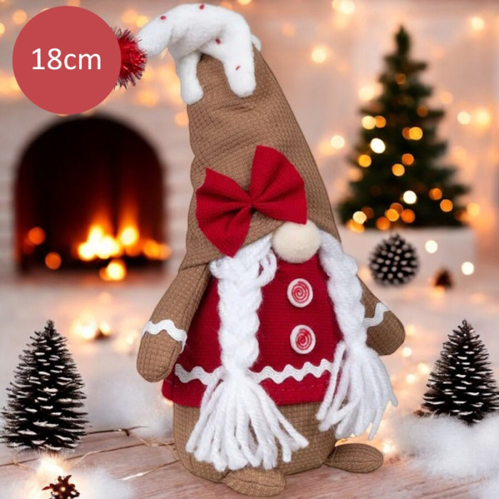 Maak kennis met deze vrolijke Handgemaakte Vrouwelijke Gnoom, klaar om jouw kerstdecoratie extra gezellig te maken! Met haar schattige rode jurkje, een speelse bruine muts met een rode strik en twee prachtige witte vlechten, is ze het stralende middelpunt van elke feestelijke setting.