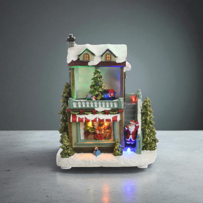 Breng je kerstdorp tot leven met dit handgeschilderde LED kersthuisje met speelgoedtrein. Het charmante ontwerp toont een gedetailleerde speelgoedwinkel met een vrolijke kerstboom, een bewegende trein en een vrolijke kerstman die je verwelkomt op de trap. De multicolor LED-verlichting zorgt voor een feestelijke gloed die perfect past bij de kerstsfeer.