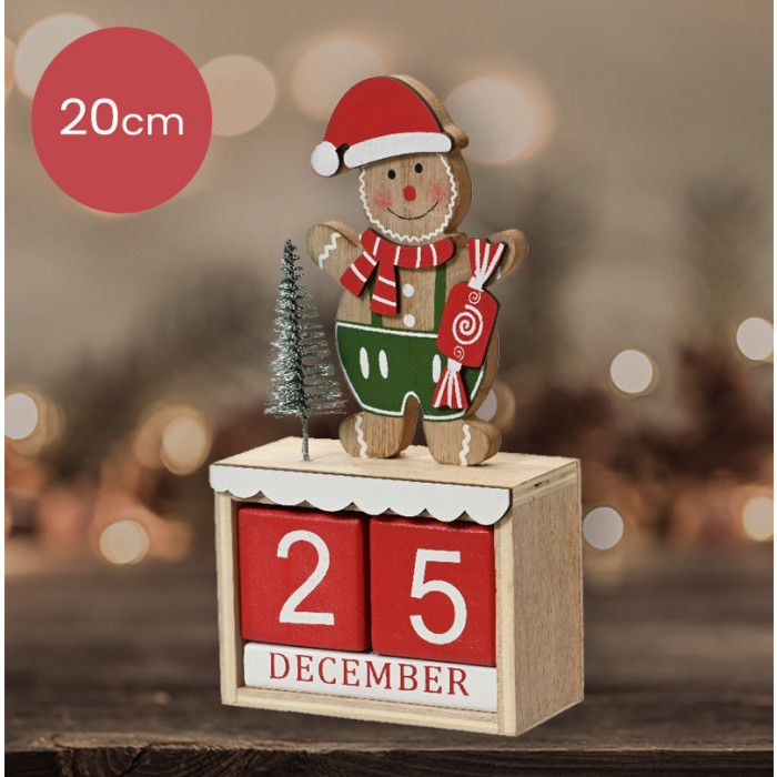 Houten Kerst adventskalender met gingerbread mannetje en rode blokken - 20 cm
