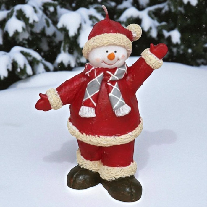 Deze kerst sneeuwpop kaars steelt de show met zijn vrolijke uitstraling en klassieke kerstoutfit. De sneeuwpop draagt een rode jas en broek met crèmekleurige randen, een warme muts en een gezellige sjaal.