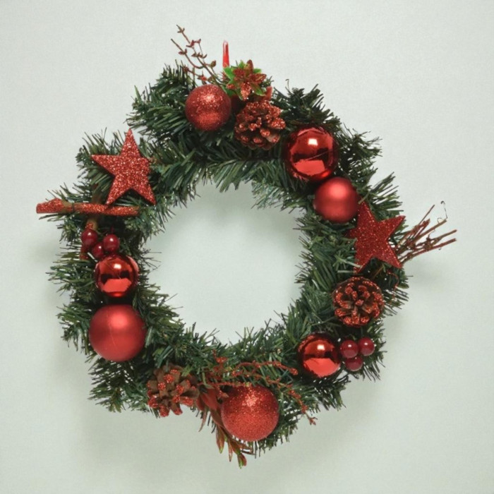 Maak van je voordeur of muur een kerstshowstopper met deze decoratieve kerstkrans in de kleuren groen en rood! Versierd met prachtige rode kerstballen, schitterende sterren en natuurlijke dennenappels, brengt deze krans direct de kerstsfeer in huis. Gemaakt van stevig kunststof, blijft hij seizoen na seizoen stralen, zonder dat je je zorgen hoeft te maken over vallende naalden.