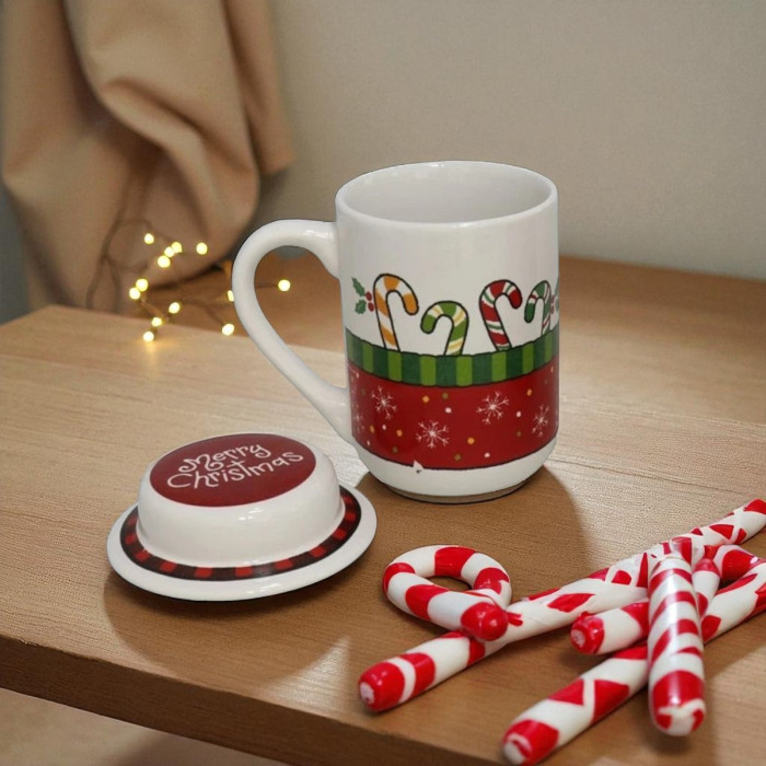 Maak je warme chocolademelk nóg feestelijker met deze kerstmok inclusief deksel en zuurstokken! Deze mok is een echte blikvanger en biedt maar liefst 400 ml ruimte voor je favoriete winterdrankje. Het deksel is niet alleen praktisch om je drankje warm te houden, maar ook stijlvol met de vrolijke tekst Merry Christmas erop.