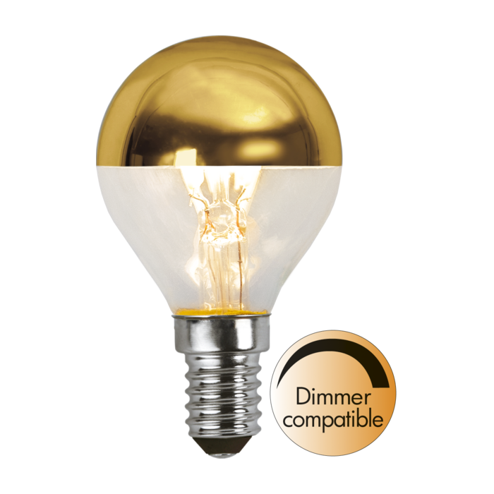 Kwalitatief hoogwaardige kopspiegellamp van Star Trading. Deze LED kogel lamp heeft een E14 fitting en is dimbaar. De lichtkleur is Extra Warm Wit - 2700K en heeft een gouden top coating. Het verbruik van deze lamp is 3.5 Watt, daarmee vervangt hij een 25W halogeenlamp in de felste stand.