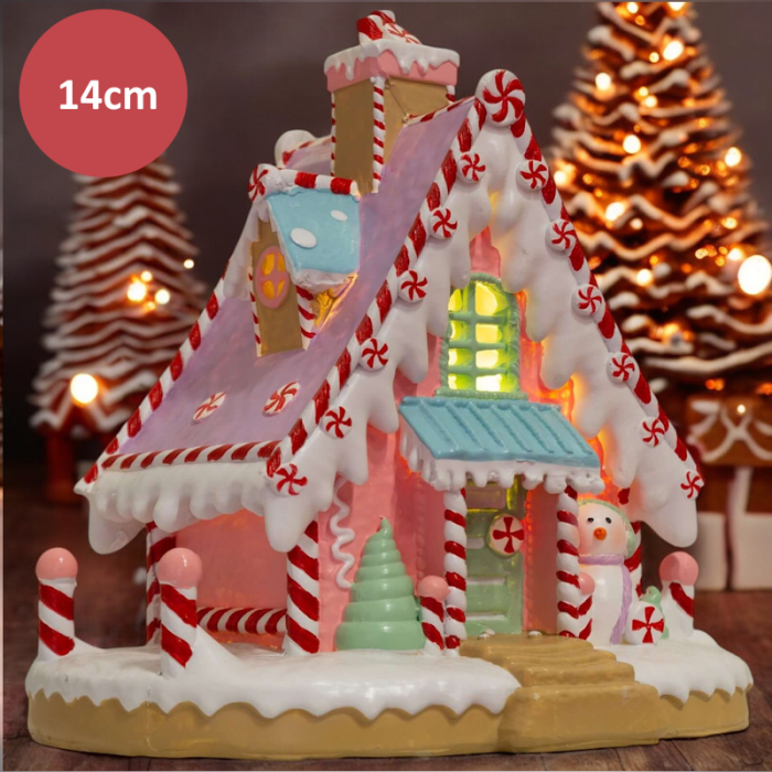 Voeg een vleugje zoetigheid toe aan je kerstdecoratie met dit charmante LED Peperkoekhuis. Met een roze dak en een besneeuwde dakrand, is dit huisje een echte eyecatcher in je feestelijke opstelling. Naast de deur staat een vrolijke sneeuwpop en het huisje is voorzien van schattige kleuren en handgemaakte details, wat het een unieke en feestelijke uitstraling geeft. Gemaakt van stevig polyresin, straalt dit huisje warmte en gezelligheid uit.