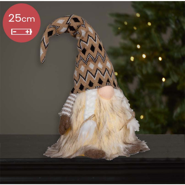 Dit schattige beige Gnoom-vrouwtje is een prachtige decoratieve toevoeging aan je huis. Met haar LED-verlichting en zwart/witte mutsversiering zal ze een betoverende sfeer creëren.