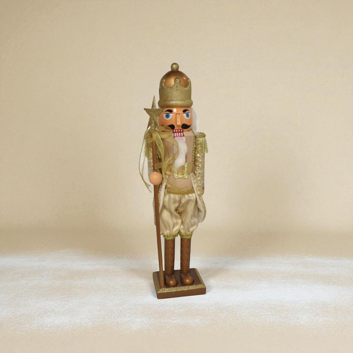 Deze luxe gouden notenkraker met staf is een echte blikvanger voor jouw kerstdecoratie. Met zijn schitterende goudkleurige outfit, elegante staf en klassieke details voegt hij direct een feestelijke en traditionele sfeer toe aan je interieur. Perfect voor op de vensterbank, naast de kerstboom of als centerpiece op een dressoir.
