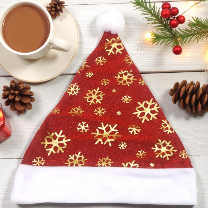 Laat de feestdagen schitteren met deze luxe kerstmuts met gouden sneeuwvlokken en glitters. Deze stijlvolle kerstmuts is dé perfecte keuze voor wie wat extra glamour aan zijn kerstoutfit wil toevoegen. De dieprode stof met glinsterende afwerking en goudkleurige sneeuwvlokken zorgt voor een feestelijke uitstraling tijdens elk kerstfeest, diner of bedrijfsborrel.