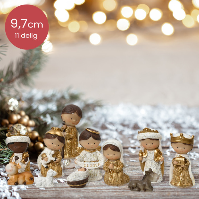 De 11-delige set bevat 3 koningen (Drie Wijzen uit het Oosten), Maria, Jezus, Jozef, een engel, herder, een os, een ezel en een schaap.
