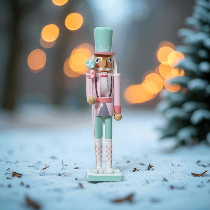 Met een hoogte van 38 cm en een uniek, kleurrijk ontwerp is dit decoratieve figuur een feest voor het oog. De notenkraker draagt een blauwe hoge hoed, een roze jasje, en een blauwe broek, wat hem een speels en opvallend uiterlijk geeft. Zijn witte hoge laarzen voegen een elegante touch toe, terwijl hij een dirigeerstok in de vorm van een lolly vasthoudt