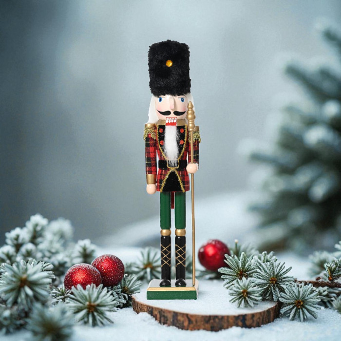 Breng koninklijke flair in je kerstdecoratie met de notenkraker met bontmuts en dirigeerstok! Met zijn compacte hoogte van 38 cm en verfijnde details is deze notenkraker een charmante toevoeging aan elk interieur.