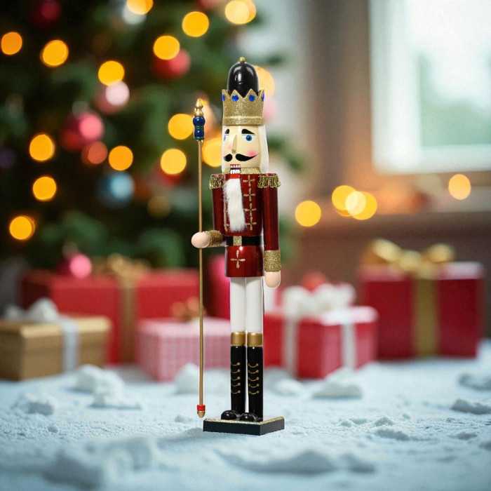 Gekleed in een rijk gedetailleerd uniform en voorzien van een koninklijke kroon, straalt deze notenkraker klassieke elegantie uit. Met een dirigeerstok in de hand en een statige houding, brengt hij de magie van kerst tot leven in elke ruimte.