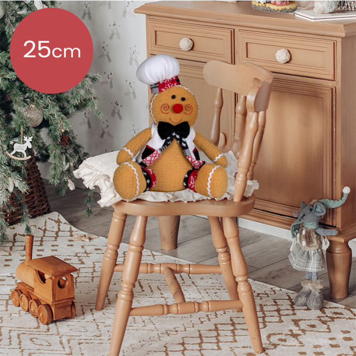 Dit schattige peperkoek-figuur is een prachtige decoratieve toevoeging aan je huis. Met zijn witte muts en zwarte strik zal hij een feestelijke en zoete sfeer creëren.