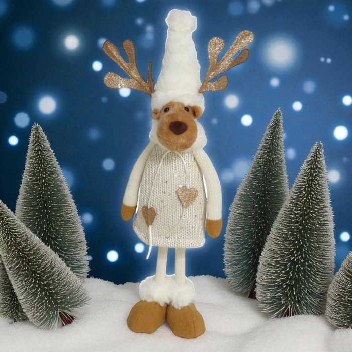 Maak kennis met het meest hartverwarmende rendier van het seizoen! Dit pluche rendier straalt pure kerstliefde uit met zijn gebreide outfit versierd met glitterende hartjes en een fluffy puntmuts. Zijn gouden glinstergweien en zachte laarsjes maken hem helemaal onweerstaanbaar. Zet hem op een plank, onder de kerstboom of op de schouw en laat hem jouw kerstdecoratie compleet maken!