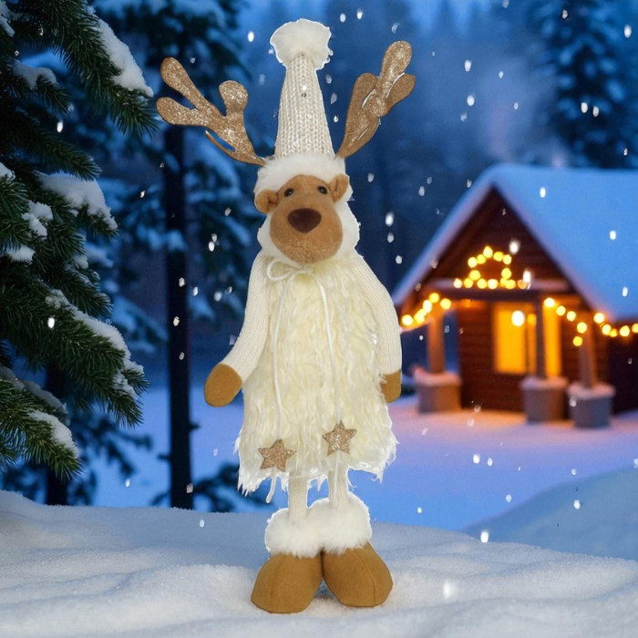 Dit pluche rendier is dé ster van jouw kerstdecoratie! Met zijn gebreide puntmuts, glinsterende sterren aan zijn zachte outfit en een fluffy winterlook is hij het toppunt van knusse kerstgezelligheid. Zijn goudkleurige geweien en wollige laarsjes maken hem helemaal kerstfeest-proof. Perfect voor op de vensterbank, onder de kerstboom, of als gastheer bij de voordeur.