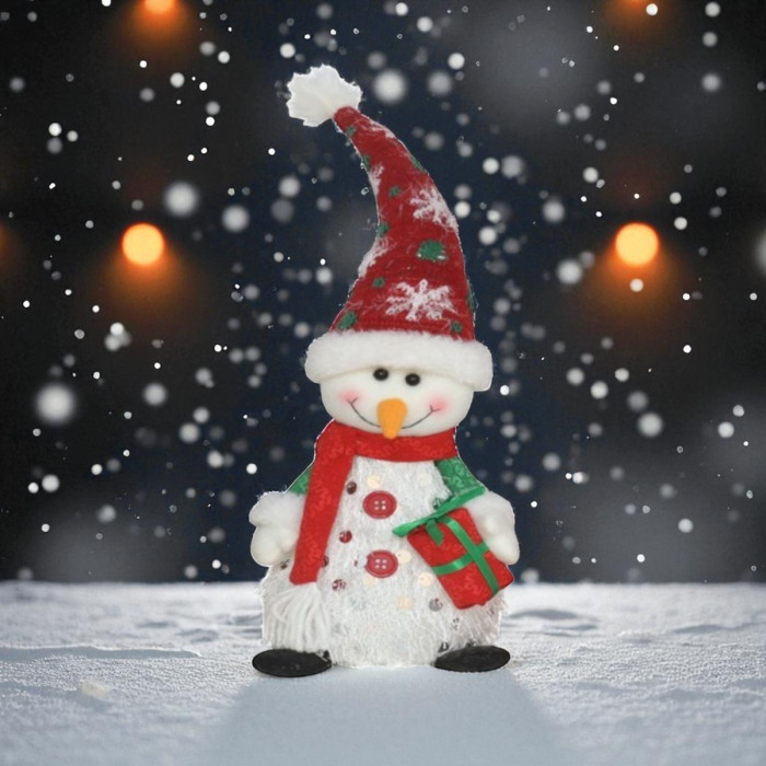 Laat deze sneeuwpop je kerstdecoratie compleet maken. Zet hem neer en zie hoe zijn glimlach en sprankelende licht je huis omtoveren tot een winterwonderland. Een perfecte toevoeging voor een knusse en vrolijke kerst.