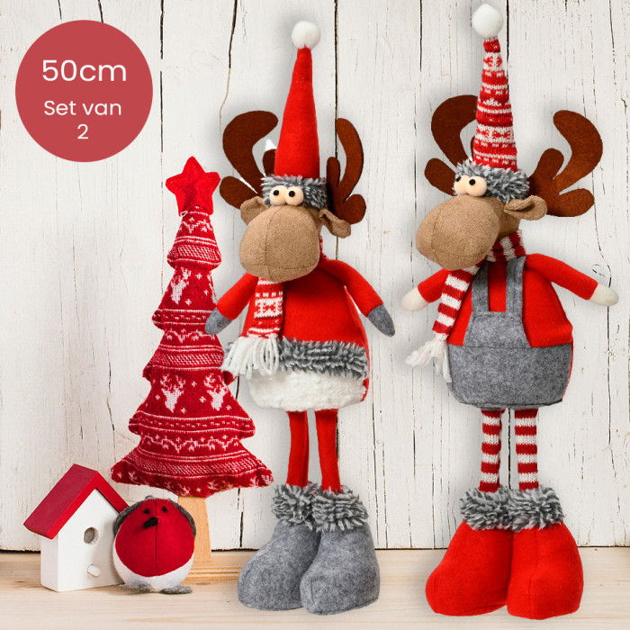 Voeg deze prachtige rendieren met muts toe aan je kerstdecoratie! De rendieren zijn gemaakt van polyester en hebben een hoogte van 50 cm. Ze zien er schattig uit met zijn rode en gestreepte muts en passen in ieder huis.