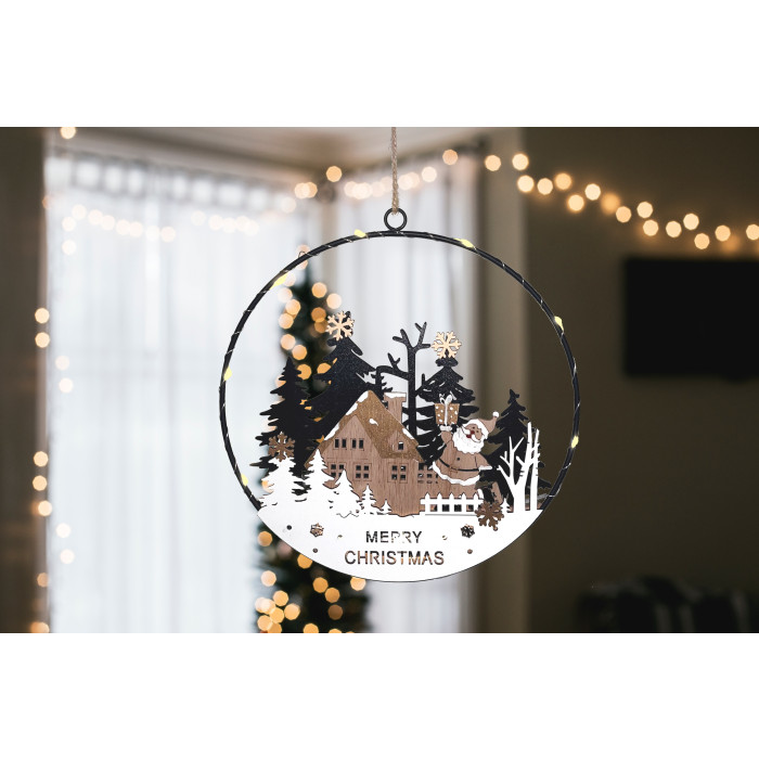 Maak je raam helemaal kerst-proof met de Raamdecoratie Kerstlandschap "Santa"! In een sfeervol, rond metalen frame speelt zich een hartverwarmend kersttafereel af: een knus houten huisje, versierde kerstbomen en natuurlijk de kerstman die iedereen vrolijk toewuift. De 10 warmwitte LEDs brengen dit tafereel tot leven.
