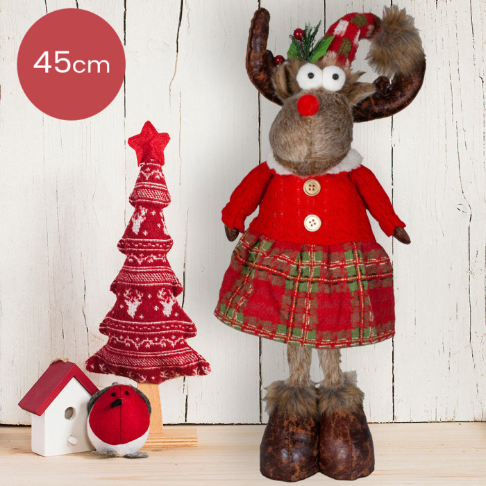 Dit schattige bruine Rendier-vrouwtje is een prachtige decoratieve toevoeging aan je huis. Met haar rood/groen geblokte jurkje zal ze een vrolijke en feestelijke sfeer creëren.