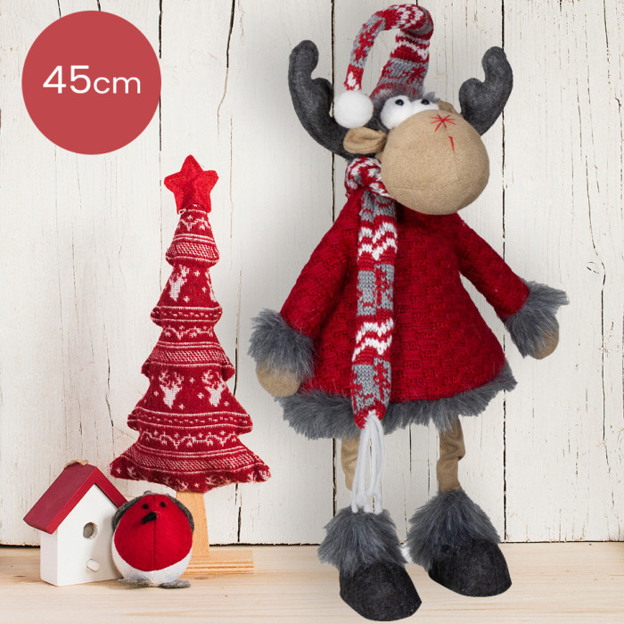 Het Rendier-figuur heeft een zichtbare hoogte van 45 cm. Maar als je de hoogte meet vanaf het onderste punt van de voet tot de top van zijn muts, is het 55 cm hoog.