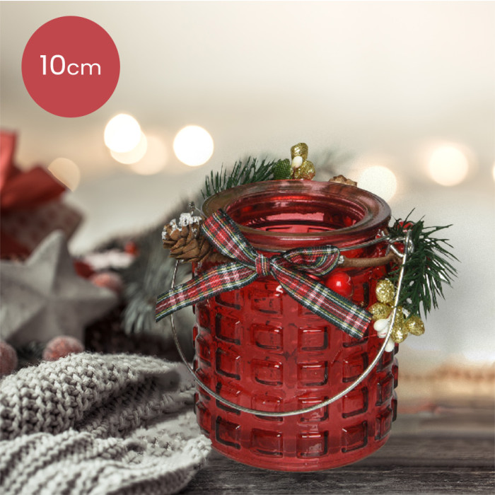 Deze rode glazen waxinelichthouder is een mooie toevoeging aan elk interieur. Het geblokte patroon geeft de houder een bijzonder effect wanneer een kaars wordt aangestoken. De versiering maakt het geheel af en geeft een extra touch aan de houder.