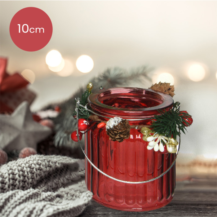 Rode glazen waxinelichthouder met ribbels en versiering - Ø8 x 10 cm