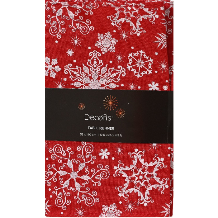 Voeg een feestelijk accent toe aan je eettafel met deze rode kerst tafelloper met sierlijke witte sneeuwvlokken. De tafelloper is gemaakt van polyester en heeft een afmeting van 150 x 32 cm, perfect voor zowel lange als korte tafels.