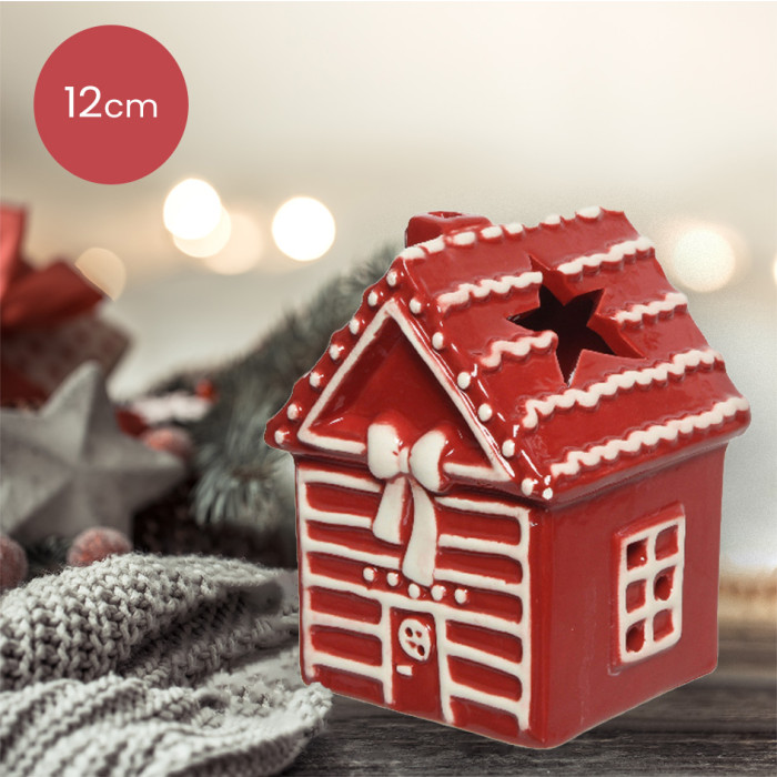 Rode waxinelichthouder huisje met geribbeld dak van dolomiet - 12cm