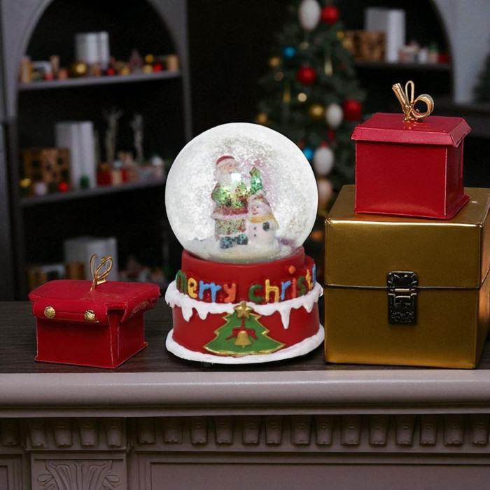 Deze schudbol met Kerstman en sneeuwpop combineert klassieke kerstmagie met vrolijke details. Binnenin de glazen bol staan de kerstman en een blije sneeuwpop zij aan zij, omgeven door dwarrelende sneeuw zodra je de bol beweegt. De rode voet is versierd met de tekst “Merry Christmas” in vrolijke kleuren en een kerstboom met gouden bel.
