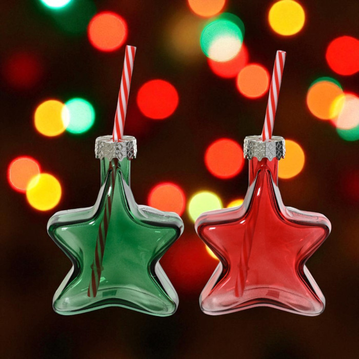 Set van 2 Stervormige glazen drinkbekers met rietje – Rood & Groen – Kerstdesign