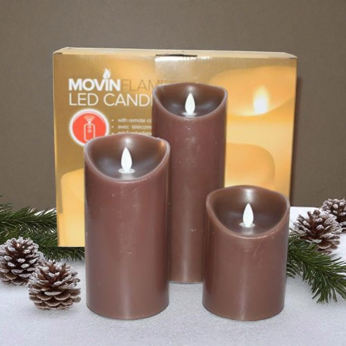 Set van 3 wax kaarsen met vlameffect - bruin ø9 cm