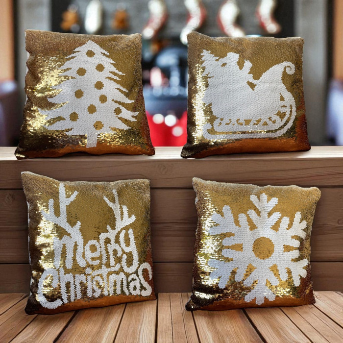 - Set van 4 kussenhoezen met pailletten in goud en kerstmotief