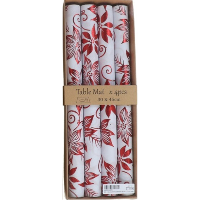 Set van 4 kerst placemats met bloemen – wit met rood – 30 x 45 cm