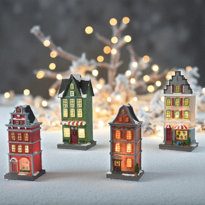 Breng je kerstdorp tot leven met deze sfeervolle set van 4 LED kersthuisjes. Elk huisje is voorzien van warm wit licht dat een gezellige en uitnodigende gloed verspreidt. Met hun charmante details en gevarieerde gevels zijn deze huisjes een perfecte toevoeging aan je kerstdecoratie.