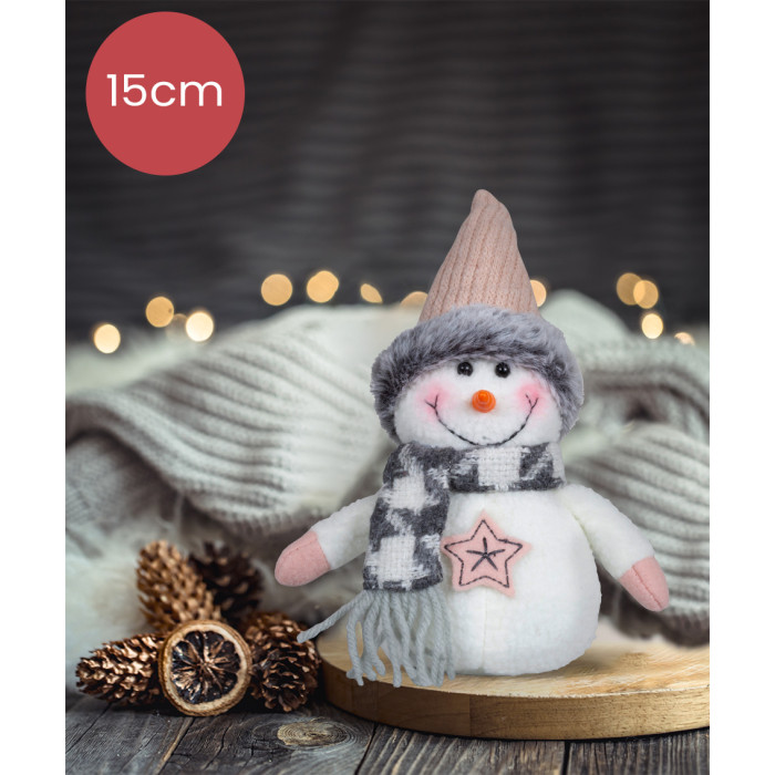 Deze moderne sneeuwpop is een stijlvolle toevoeging aan je decoratie. Met zijn witte kleur, grijze sjaal en roze ster zal hij een eigentijdse en feestelijke sfeer creëren.